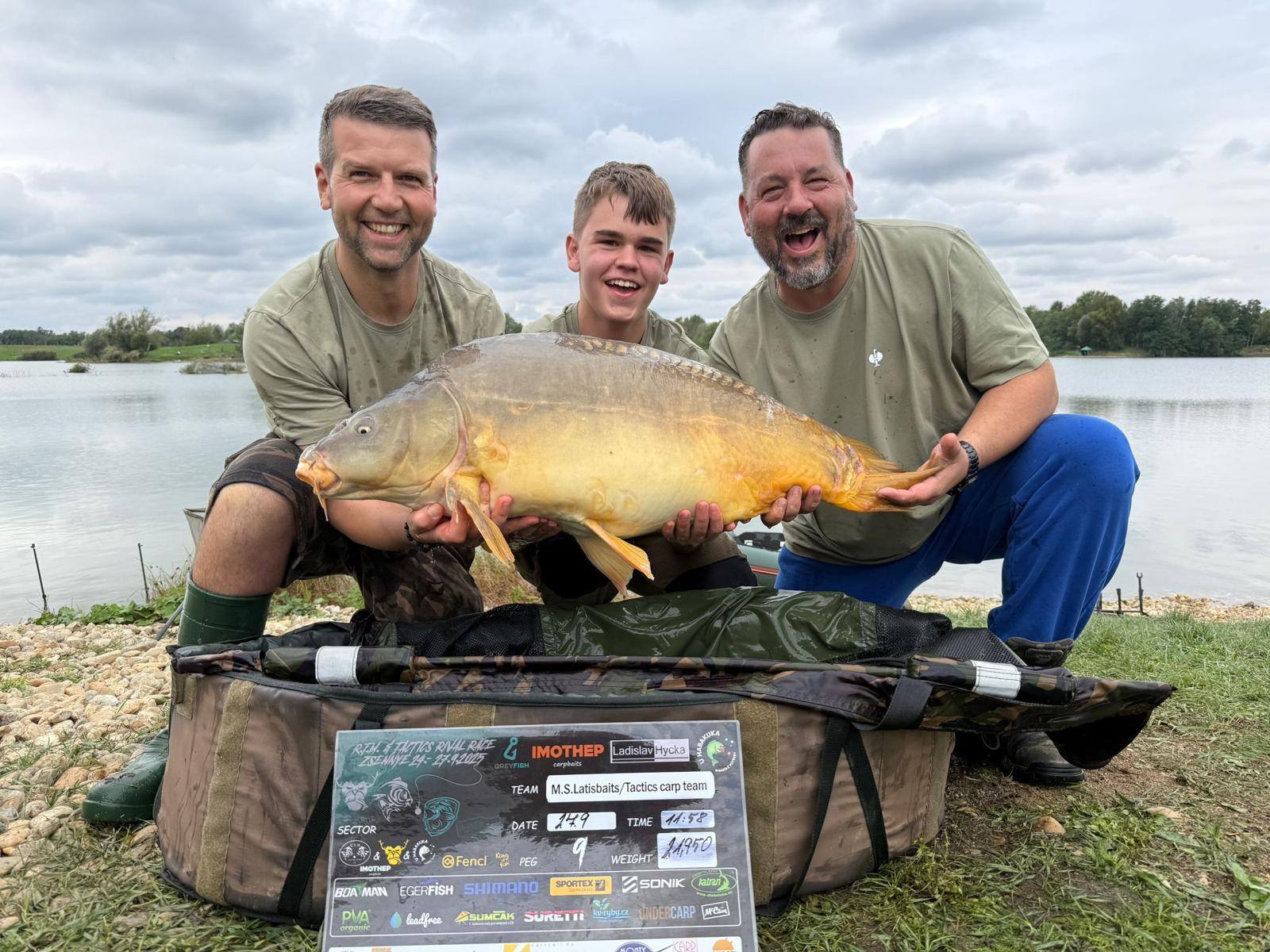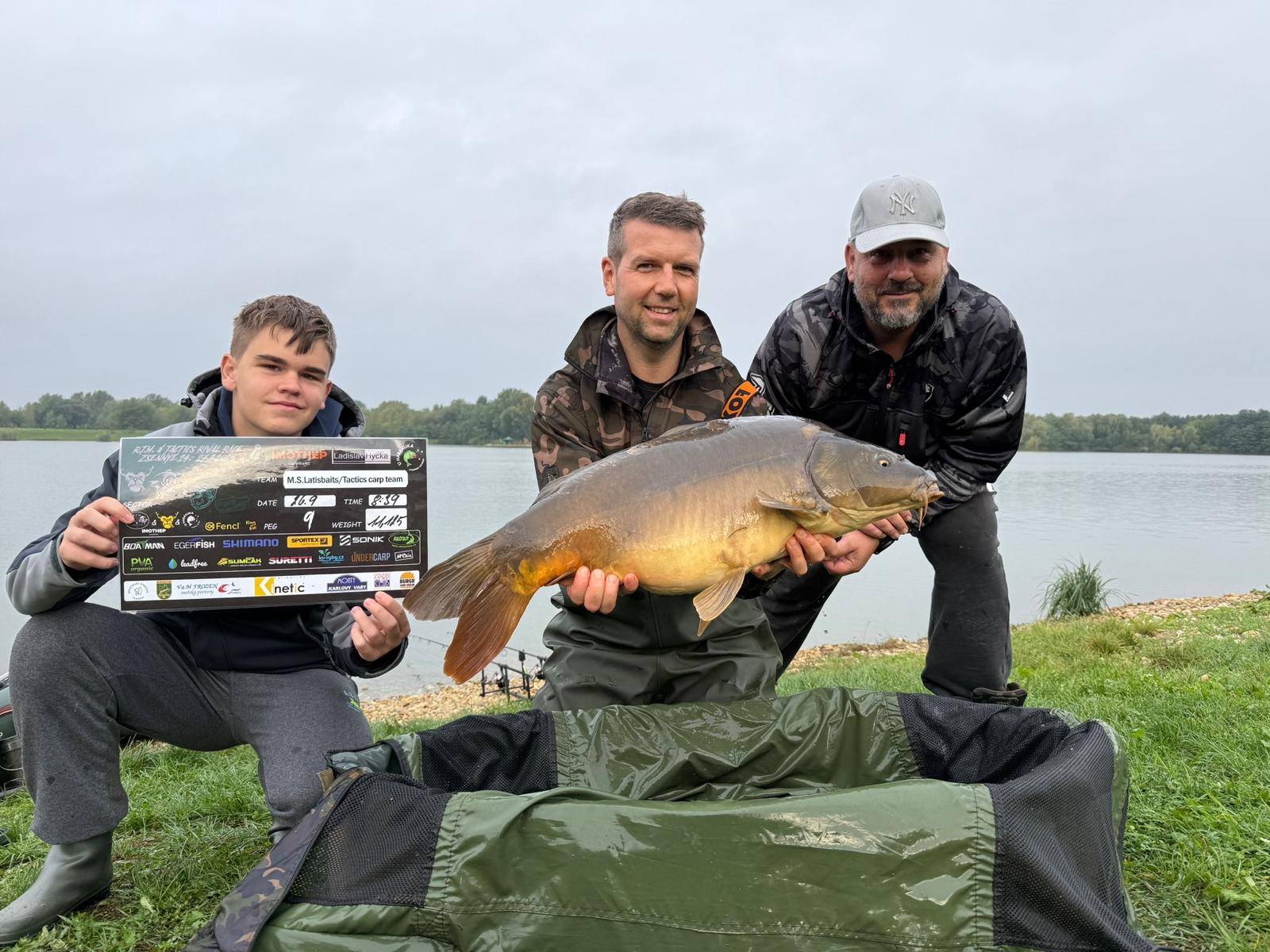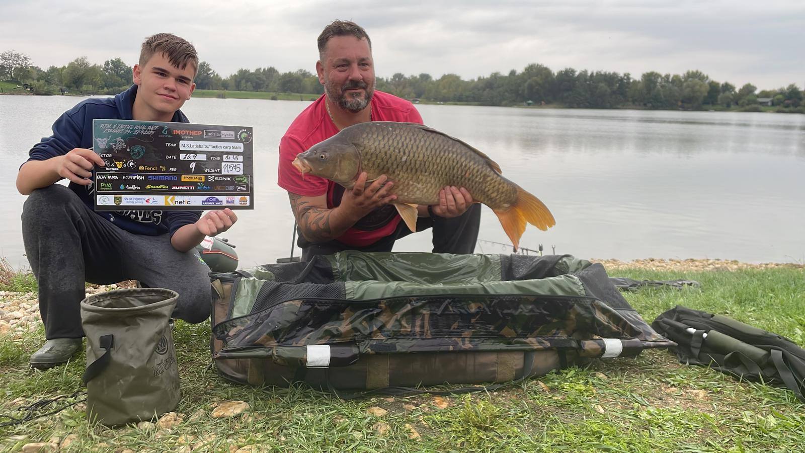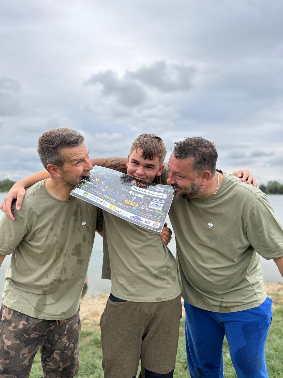 Padla 11 hodina a najednou to Davidovi píplo,zdolává pěknou čtrnácku a začíná se to rozjíždět,má záběr i na druhý prut,pak se to rozjede i mně, v akci jsme najednou tři..v 11:21 píšeme rozhodčímu v sektoru že máme v saku body, přišlo vážení a David zdolává další rybu,chci aby si nahodil,tak prut přebírám a dokončuji další zdolávačku a kapra 14+,říkám Davidovi,ať se stáhne do leva a k poloostrovu přesouvám jeden svůj prut,netrvá to dlouho a mam jízdu a na druhém konci lysce 13+,už přepisujeme, David zase zdolává,je čas kolem 11:45,máme 15 minut,dokončujeme vážení předchozího kapra a dejvovi se rozjíždí další prut,ani jeden z nás nemůžeme, tak prut bere mladý Mára, zdolává, my tomu nevěnujeme nějak pozornost, až když vidím,že je kapr kousek od břehu,jdu mu pomoci a rybu podebrat,vidím větší hlavu,říkám si body,ten by mohl mít 15+,kapra vytáhneme v té euforii na podložku a rozhodčí, který už zůstal u nás,říká, ten má 20kg,váha ukazuje se sakem 23 a kousek,kapr z říše snů s váhou nad 21kg nás zhruba 5 minut před koncem závodu háže na první místo a my jsme v totálním laufu, naše skvělé ženy po telefonu namlouvají emotivní zprávy a rozhodčí LUĎA má z toho slzy v očích…jsme šťatný neskutečně pyšný a vlastně nemáme slov,po konci závodu stojíme,koukáme na sebe, smějeme se, obímáme se a vlastně nevíme jak s tím pocitem ještě naložit….co se to stalo,donesl nám leďnáček štěstí,bylo to kvalitou boilies, kterou si kapři vybrali, sakra co se to stalo…nepopsatelný pocit, kerý zůstane v mém srdci ještě řadu let..vítězíme s váhou přes 100kg(zbytek a přesné počty ve fotkách).