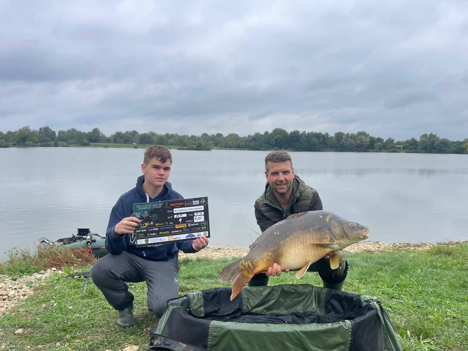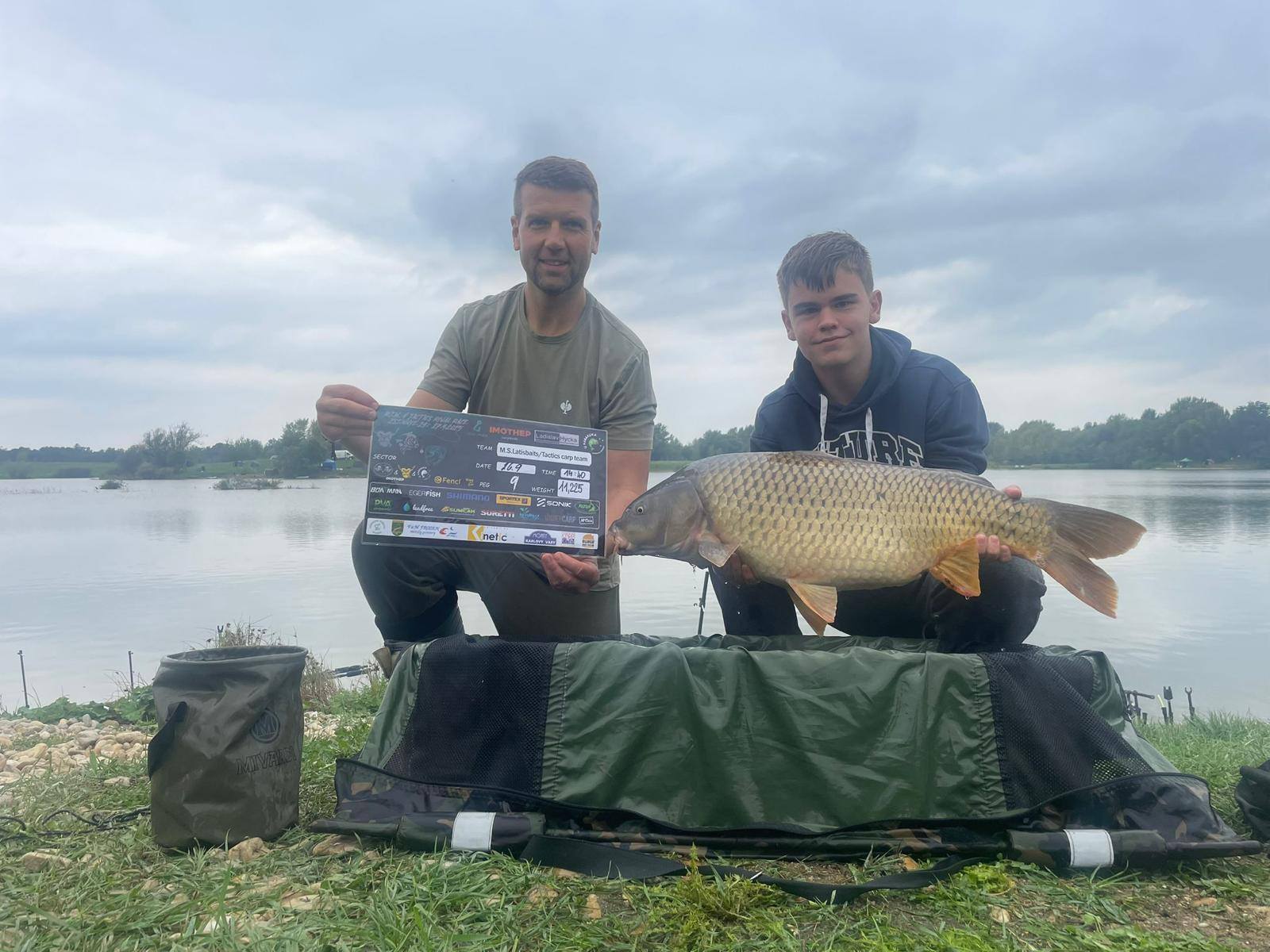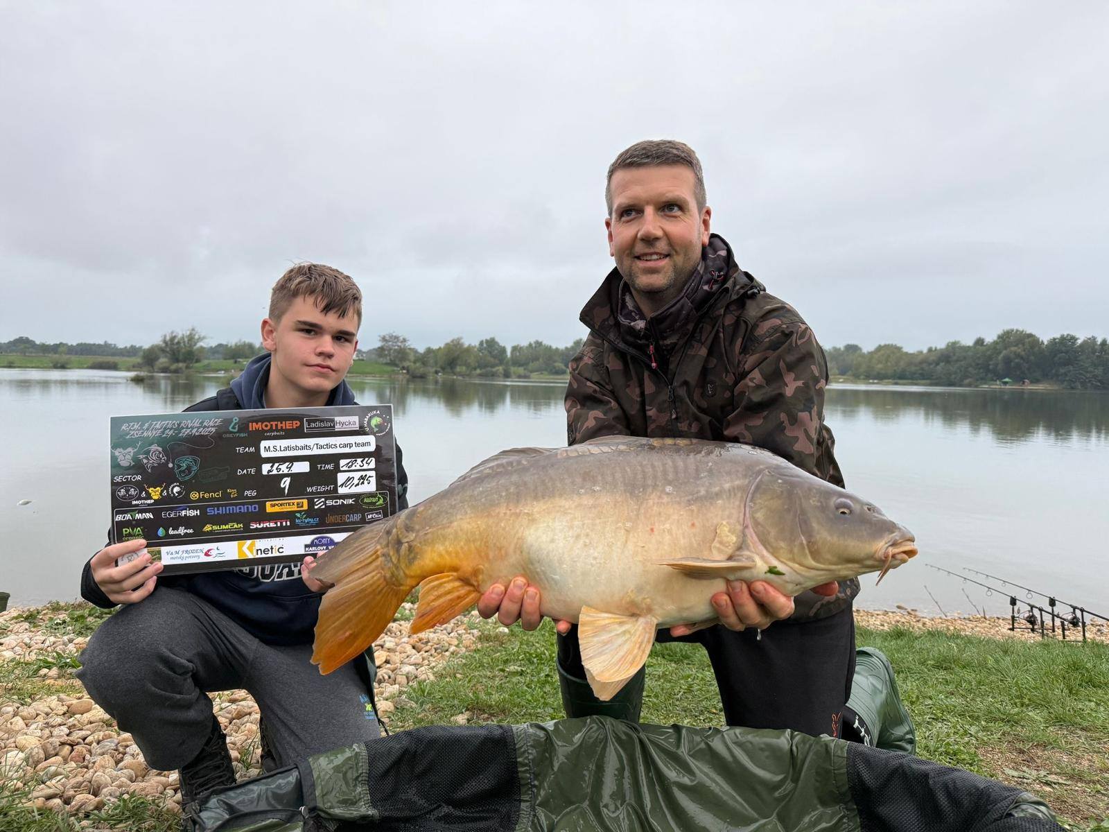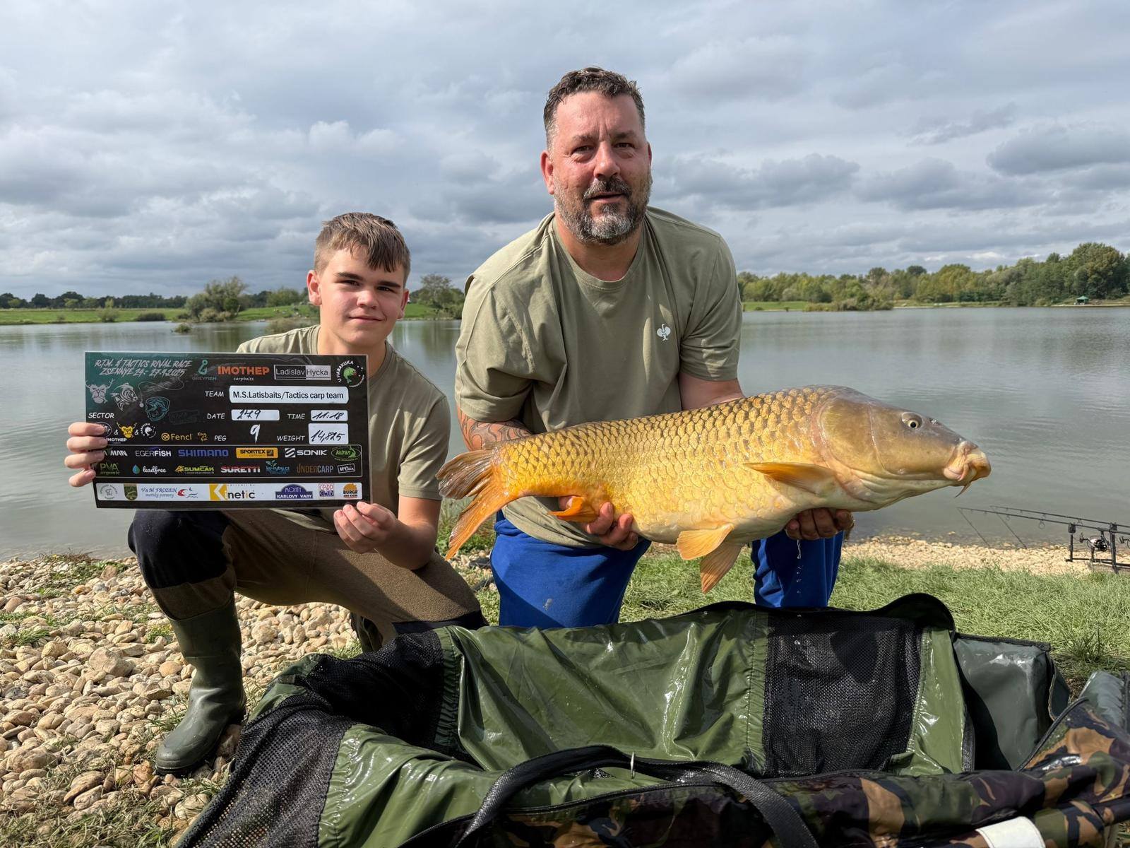 Padla 11 hodina a najednou to Davidovi píplo,zdolává pěknou čtrnácku a začíná se to rozjíždět,má záběr i na druhý prut,pak se to rozjede i mně, v akci jsme najednou tři..v 11:21 píšeme rozhodčímu v sektoru že máme v saku body, přišlo vážení a David zdolává další rybu,chci aby si nahodil,tak prut přebírám a dokončuji další zdolávačku a kapra 14+,říkám Davidovi,ať se stáhne do leva a k poloostrovu přesouvám jeden svůj prut,netrvá to dlouho a mam jízdu a na druhém konci lysce 13+,už přepisujeme, David zase zdolává,je čas kolem 11:45,máme 15 minut,dokončujeme vážení předchozího kapra a dejvovi se rozjíždí další prut,ani jeden z nás nemůžeme, tak prut bere mladý Mára, zdolává, my tomu nevěnujeme nějak pozornost, až když vidím,že je kapr kousek od břehu,jdu mu pomoci a rybu podebrat,vidím větší hlavu,říkám si body,ten by mohl mít 15+,kapra vytáhneme v té euforii na podložku a rozhodčí, který už zůstal u nás,říká, ten má 20kg,váha ukazuje se sakem 23 a kousek,kapr z říše snů s váhou nad 21kg nás zhruba 5 minut před koncem závodu háže na první místo a my jsme v totálním laufu, naše skvělé ženy po telefonu namlouvají emotivní zprávy a rozhodčí LUĎA má z toho slzy v očích…jsme šťatný neskutečně pyšný a vlastně nemáme slov,po konci závodu stojíme,koukáme na sebe, smějeme se, obímáme se a vlastně nevíme jak s tím pocitem ještě naložit….co se to stalo,donesl nám leďnáček štěstí,bylo to kvalitou boilies, kterou si kapři vybrali, sakra co se to stalo…nepopsatelný pocit, kerý zůstane v mém srdci ještě řadu let..vítězíme s váhou přes 100kg(zbytek a přesné počty ve fotkách).