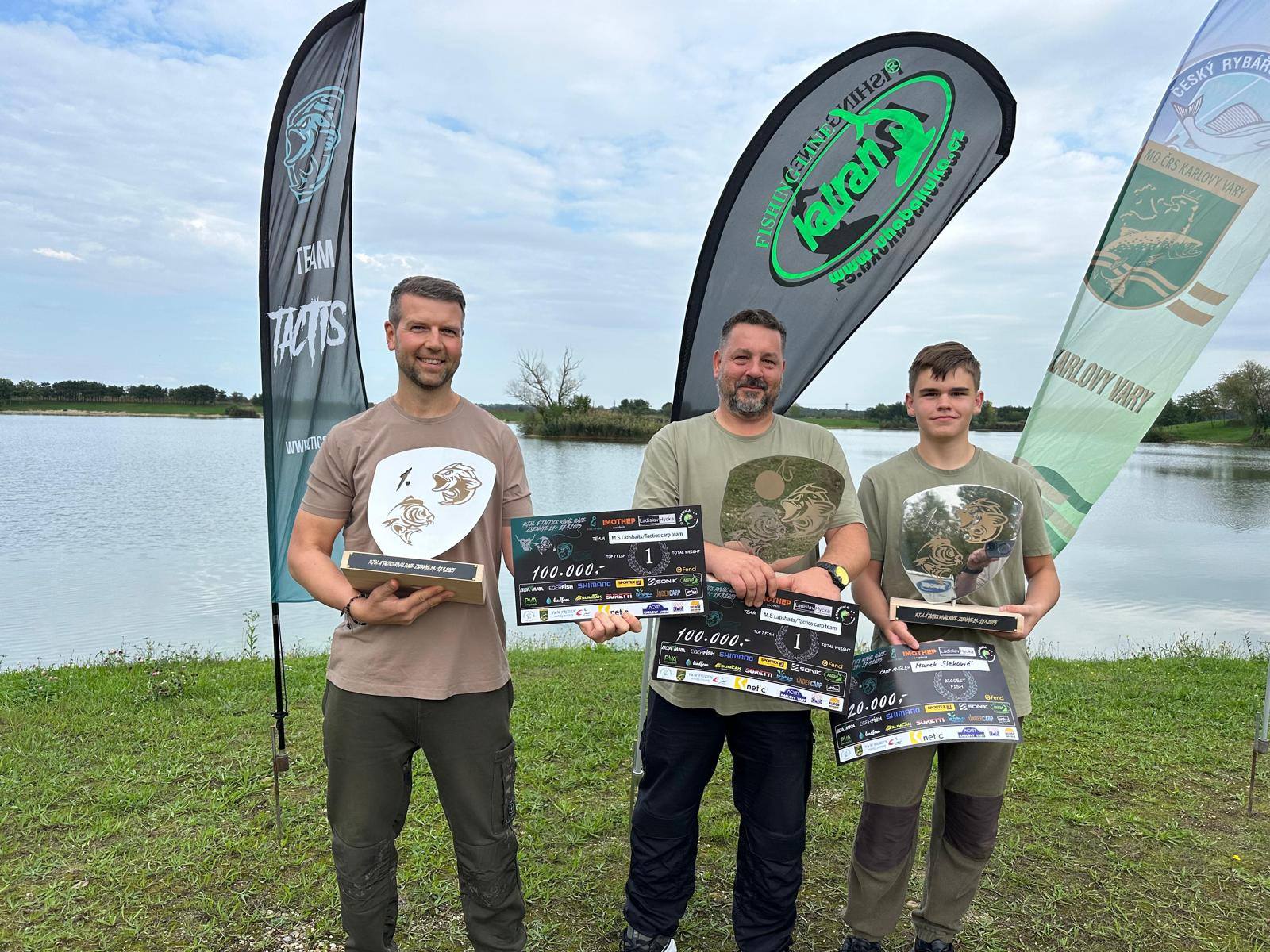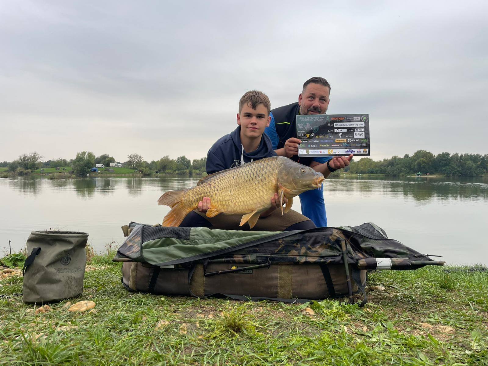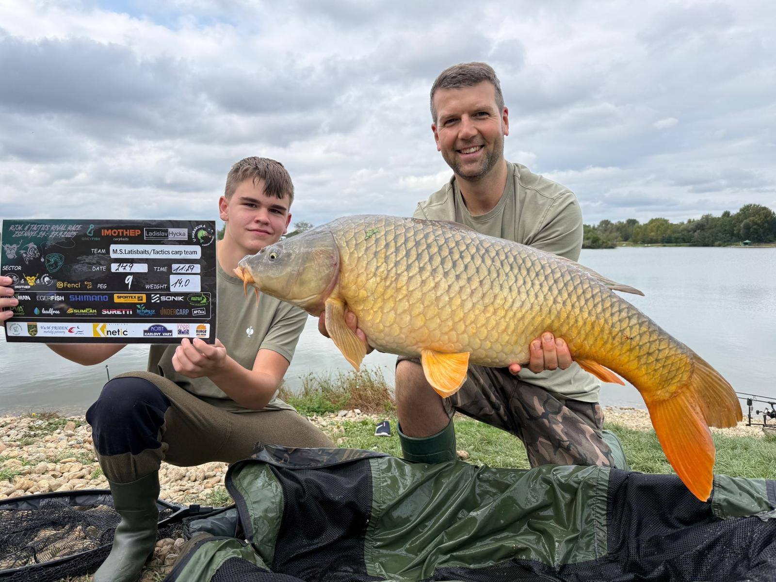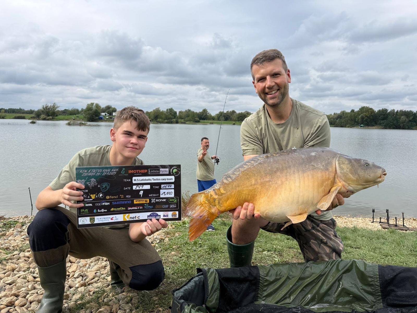 Padla 11 hodina a najednou to Davidovi píplo,zdolává pěknou čtrnácku a začíná se to rozjíždět,má záběr i na druhý prut,pak se to rozjede i mně, v akci jsme najednou tři..v 11:21 píšeme rozhodčímu v sektoru že máme v saku body, přišlo vážení a David zdolává další rybu,chci aby si nahodil,tak prut přebírám a dokončuji další zdolávačku a kapra 14+,říkám Davidovi,ať se stáhne do leva a k poloostrovu přesouvám jeden svůj prut,netrvá to dlouho a mam jízdu a na druhém konci lysce 13+,už přepisujeme, David zase zdolává,je čas kolem 11:45,máme 15 minut,dokončujeme vážení předchozího kapra a dejvovi se rozjíždí další prut,ani jeden z nás nemůžeme, tak prut bere mladý Mára, zdolává, my tomu nevěnujeme nějak pozornost, až když vidím,že je kapr kousek od břehu,jdu mu pomoci a rybu podebrat,vidím větší hlavu,říkám si body,ten by mohl mít 15+,kapra vytáhneme v té euforii na podložku a rozhodčí, který už zůstal u nás,říká, ten má 20kg,váha ukazuje se sakem 23 a kousek,kapr z říše snů s váhou nad 21kg nás zhruba 5 minut před koncem závodu háže na první místo a my jsme v totálním laufu, naše skvělé ženy po telefonu namlouvají emotivní zprávy a rozhodčí LUĎA má z toho slzy v očích…jsme šťatný neskutečně pyšný a vlastně nemáme slov,po konci závodu stojíme,koukáme na sebe, smějeme se, obímáme se a vlastně nevíme jak s tím pocitem ještě naložit….co se to stalo,donesl nám leďnáček štěstí,bylo to kvalitou boilies, kterou si kapři vybrali, sakra co se to stalo…nepopsatelný pocit, kerý zůstane v mém srdci ještě řadu let..vítězíme s váhou přes 100kg(zbytek a přesné počty ve fotkách).